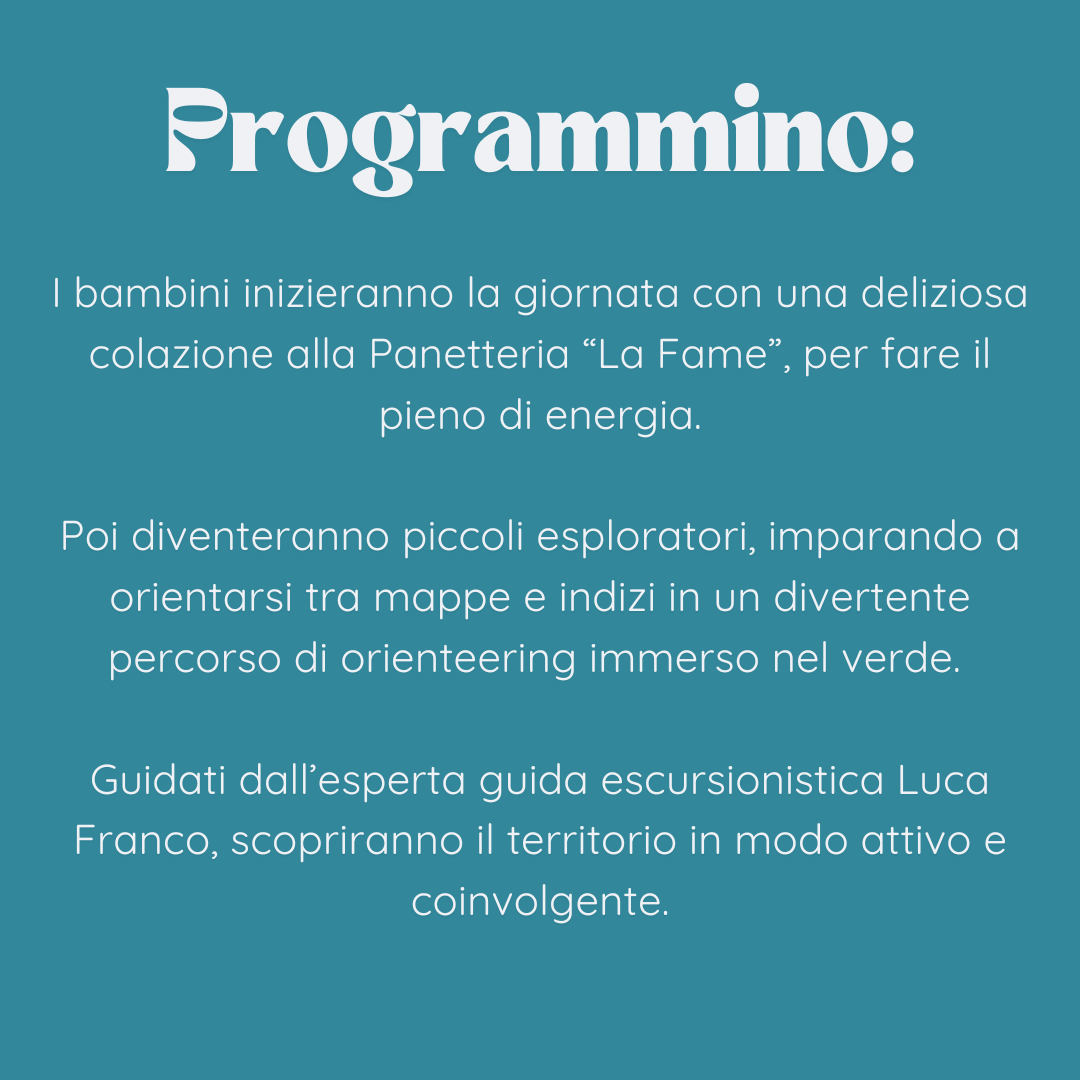 I bambini inizieranno la giornata con una deliziosa colazione, perfetta per fare il pieno di energia… poi saranno pronti a trasformarsi in piccoli esploratori. Tra mappe, indizi e natura, vivranno un entusiasmante percorso di orienteering immerso nel verde, scoprendo il territorio in modo attivo e coinvolgente.