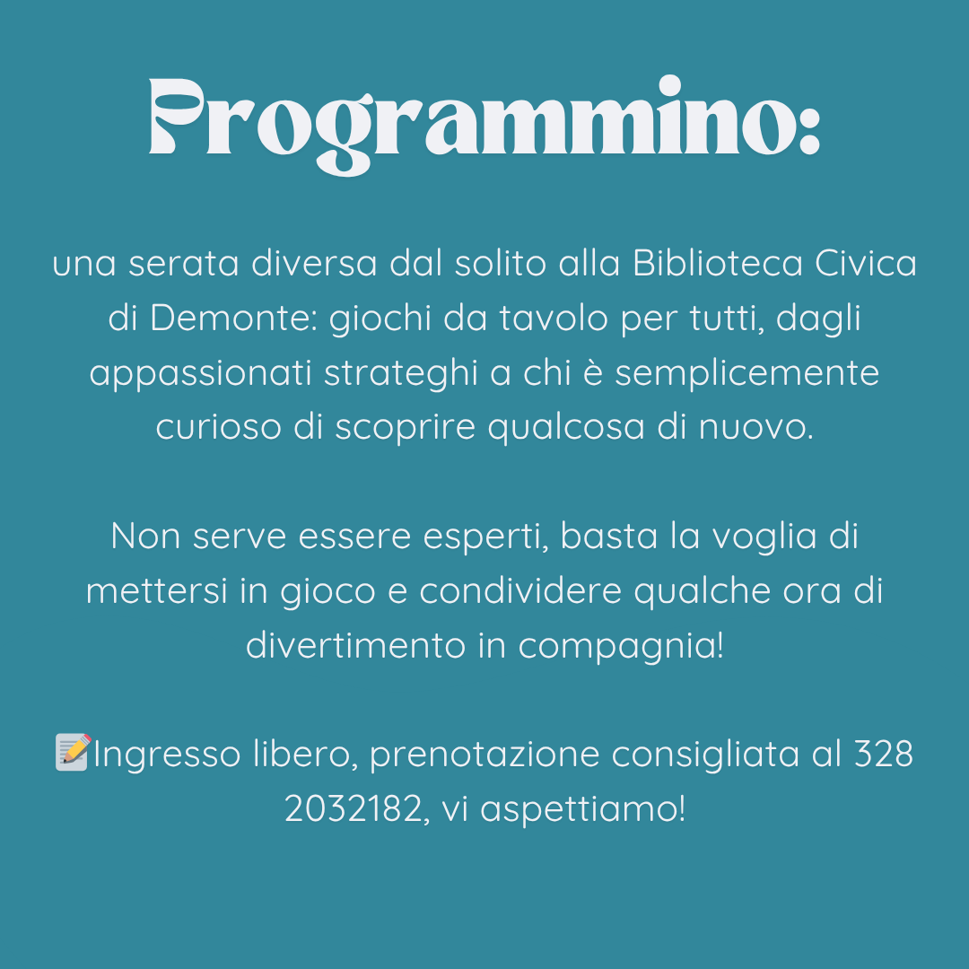 La Biblioteca Civica di Demonte apre le sue porte per una serata speciale dedicato a ragazzə e famiglie: un momento di incontro, divertimento e condivisione attraverso i giochi da tavolo.